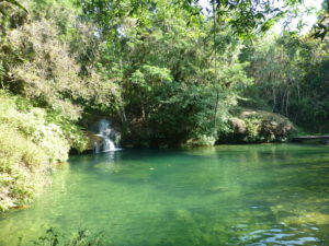 Ušli jsme ještě další asi čtvrthodinový kousek a byli jsme tam – u nádherné laguny s průzračnou příjemně chladivou vodou. Jmenuje se to tu Poza del venado (jelení tůně; je to tady: 21°57’49.0″N 80°03’22.9″W). I tady byl malinký vodopádík, kterého jsme samozřejmě využili. Nejvíc super na tom bylo právě to, že jsme tu byli asi půl hodiny úplně sami. Teprve pak se začali trousit další turisti a začalo to být jako na plovárně. Do té doby jsme si ale do syta zaplavali a zablbli pod vodopádem. Rey se vydrápal na skálu nad tůní, nějakým klackem si přitáhl liánu a Zdenda (ten jediný z nás měl tu odvahu) se zhoupnul à la Tarzan. Jen u toho tak majestátně nehalekal a z liány spíš spadnul… Ale i tak to byl výkon a je škoda, že Tarzanův kousek neviděla žádná Jane, ale jen parta vopic. Jednou z turistických grup, které se tu objevily, byla i banda Rusů.
