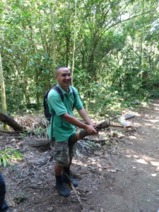 Abychom se vyhnuli záplavě turistů, vyrazili jsme dřív než většina organizovaných zájezdů. I tak jsme se ale u brány do přírodního parku Guanayara potkali s autobusem plným lidí. Nás je ale jen pět a můžeme hned vyrazit, takže jim trošku utečeme. Rey nám po cestě ukazuje keříky kávy, pozorujeme ptáky a viděli jsme i kubánského národního ptáka, trogona kubánského (místní mu podle zvuku jeho zpěvu říkají tocororo). Je to druh, který vyniká svými barvami – modrou, červenou a bílou. Proto je prý považován za národního ptáka, že nosí stejné barvy jako kubánská vlajka. Pokaždé, když nás nějaká skupinka dohnala, Rey je upozornil na nějakou blbost, u které by se rozhodně měli zastavit a jejich průvodce by jim měl něco povyprávět. To nám dává čas jim zase o kousek utéct.