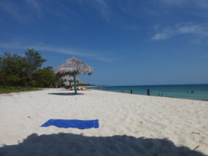 Je to od města něco přes čtrnáct kilometrů, takže cesta chvilku trvá, ale taxikář nám básní, jak je pláž skvělá, tak se těšíme. Bohužel naše nadšení bylo zpraženo notnou dávkou rozčarování. Zase tak skvělá ta pláž teda není! V písku občas nějaký ten odpadek, například vajgl od cigarety, klasicky žádné převlékárny, žádné sprchy, na kraji jeden bar, do kterého láká nepříliš vábně vypadající zřízenec, jenž obchází pláž. Jsou tu zase ty velké slunečníky, které jsme viděli už v Cienfuegu, tak si jeden, skoro poslední volný, zabíráme. Okay, pláž nic extra, ale moře tu je a to je hlavní! A to je teplé! Už když jsme smočili kotníky, zjistili jsme, že je jak kafe. Jak jste se ale nořili dál, když hladina dosáhla skoro po pás, zmocnil se vás ten nepříjemný pocit, že jste to nestihli na záchod.