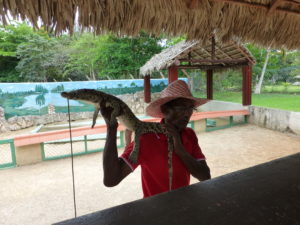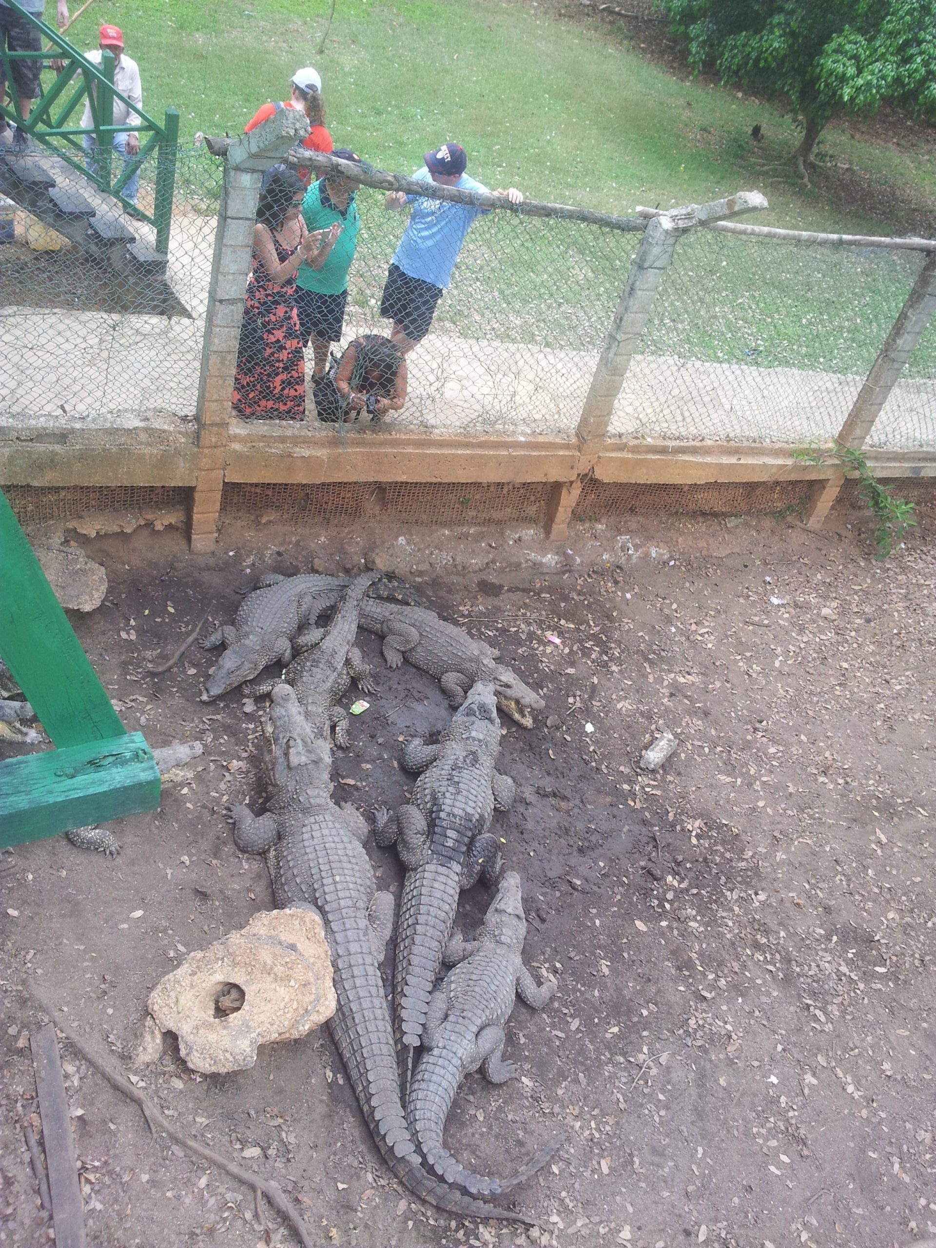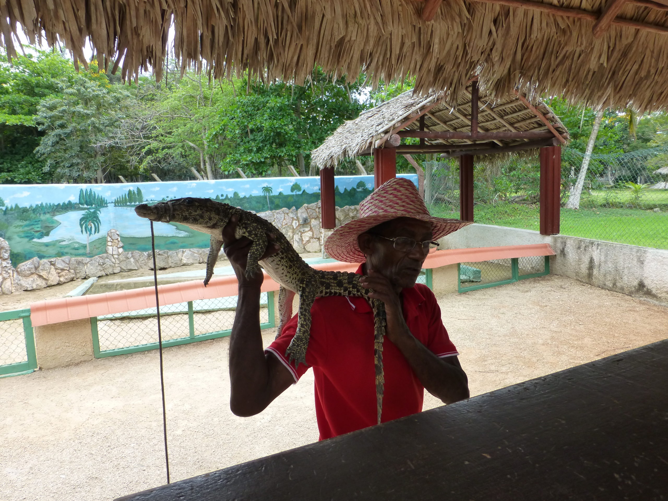 Prasátka, drůbež, kravičky… s bramborem, s knedlíky… Do mokřad se tedy nevydáme. Máme ale jiný plán. S naším taxikářem jsme si ještě domluvili, že na nás v Playa Larga tu chvilku, než se ubytujeme, počká, a pak nás po cestě zpátky hodí na krokodýlí farmu (Criadero de Cocodrilos). Je jediná svého druhu na Kubě a je to samozřejmě hlavně atrakce pro turisty. I my jsme se chytili. Dynosauři – tedy vlastně jejich kamarádi krokodýli byli hezcí, usmívali se na nás a myslím, že měli podobné myšlenky jako my při pohledu na ně. Jenže člověk to na Zemi dotáhl, kam to dotáhl, a tak ne oni na nás, ale my si nakonec pochutnali na jednom z nich. Krokodýlí maso si asi jen tak znovu k obědu nedám, ačkoliv mi chutnalo. Byl to pro mě zážitek. Popravdě ale musím uznat, že nic extra delux super wow to taky nebylo. Prostě dobré maso, nic víc, nic míň. Já osobně si jeho chuť nedovolím přirovnat k ničemu známému. Samozřejmě se u stolu vyrojily různé názory, čemu že je to zaručeně podobné, ale mně se to nezdá.